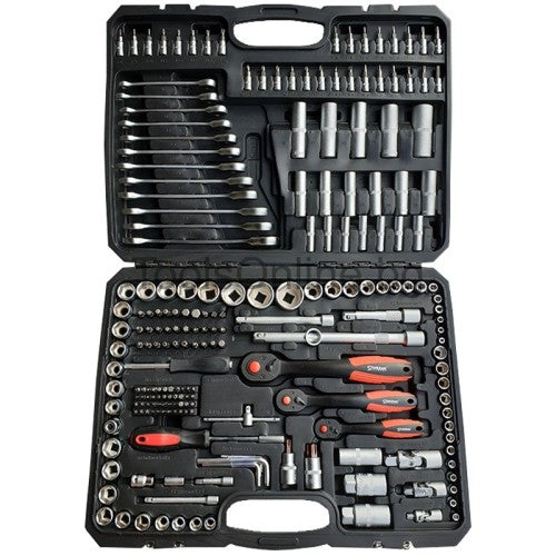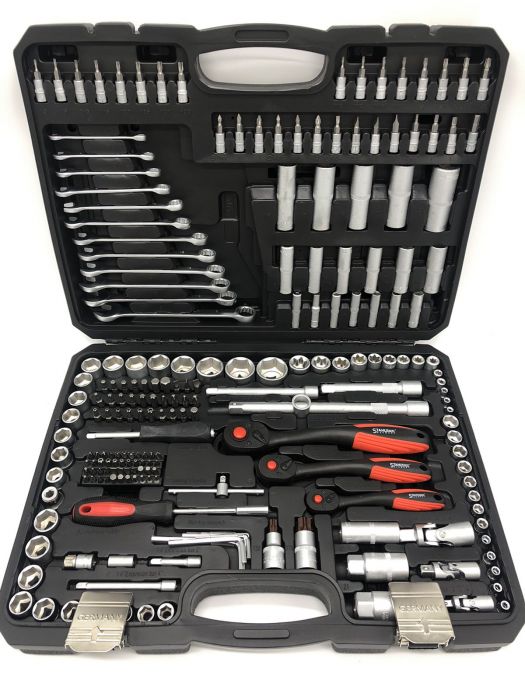 Качествен немски комплект от инструменти с усилени тресчотки,включващ всичко необходимо. Изработени от качествена хром-ванадиева стомана. Удобен за съхранение куфар, в който всичко ще седи на мястото си.